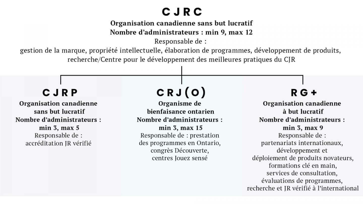 Le Centre du jeu responsable (CJR) exerce ses activités de façon indépendante en vertu de trois sociétés qui sont toutes des organisations à but non lucratif ayant leur propre conseil d’administration. Les administrateurs proviennent des quatre coins du Canada et sont des individus ayant vécu des problèmes de jeu, des fournisseurs de traitement, des membres de la direction d’exploitants de jeu et des professionnels issus d’industries qui ne sont pas liées au jeu.